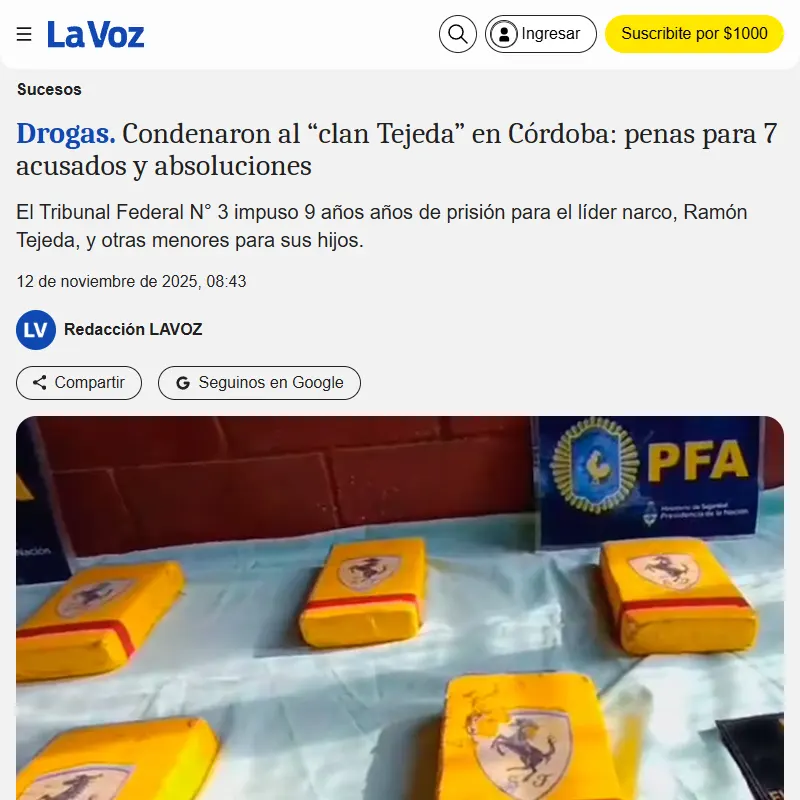 Causa Clan Tejeda Absolución Sr. Omar Tejeda La causa conocida como el «Clan Tejeda» se centra en una organización narcocriminal familiar que operaba principalmente en la ciudad de Córdoba, Argentina, dedicada al tráfico y distribución de estupefacientes a gran escala.Medios de Comunicación: Argentinos Ver enlace Ver enlace Ver enlace