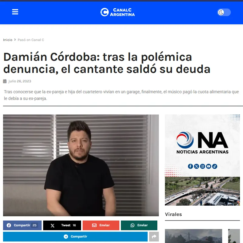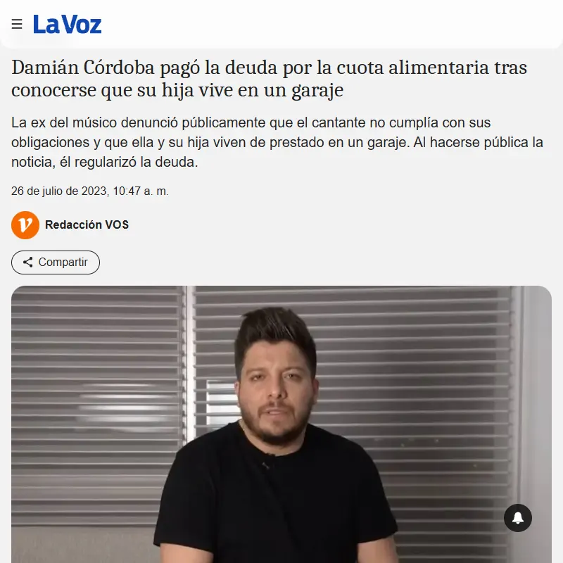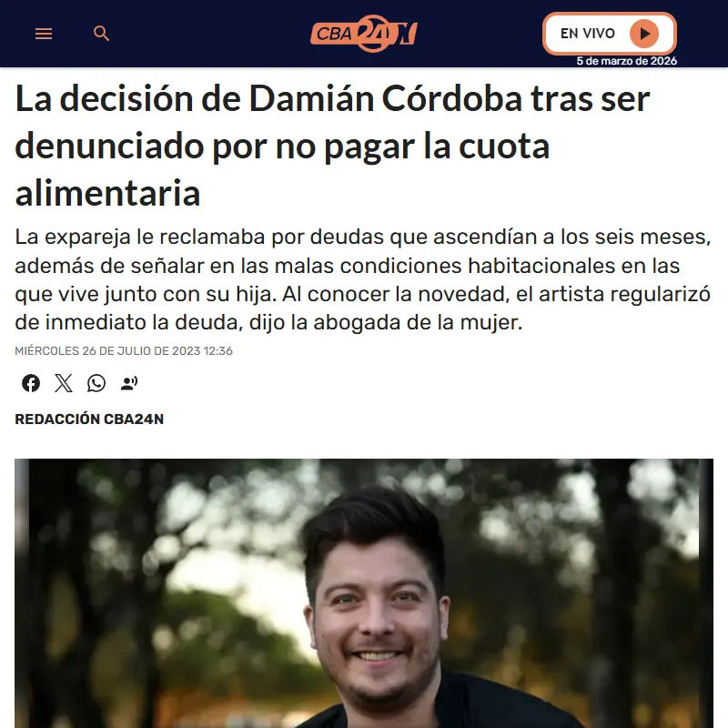 Causa Damián Córdoba Incumplimiento de obligaciones paternas La causa por manutención contra el cantante Damián Córdoba, ocurrida en julio de 2023, se trató de una denuncia pública y judicial por el impago de la cuota alimentaria de su hija, tras lo cual el músico se puso al día con sus obligaciones. Medios de Comunicación: Argentinos Ver enlace Ver enlace Ver enlace Ver enlace Ver enlace