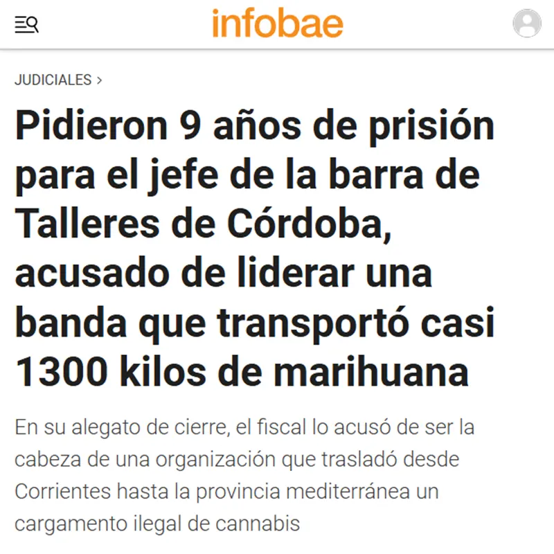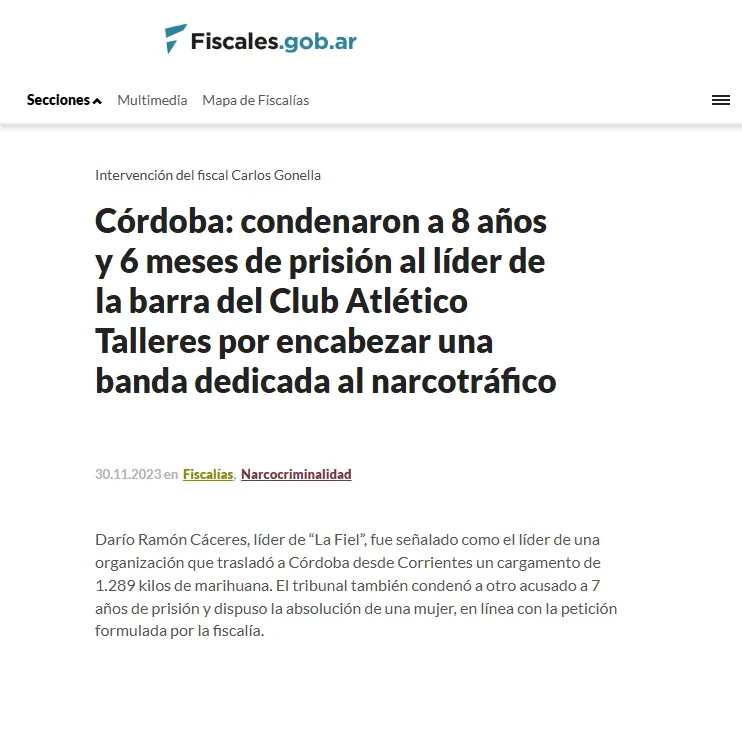 La Causa «Líder Barra Braca Club Atlético Talleres» hace referencia al proceso judicial y condena contra Darío Cáceres, el jefe de la barra brava del Club Atlético Talleres (conocida como «La Fiel»), por encabezar una organización dedicada al narcotráfico.